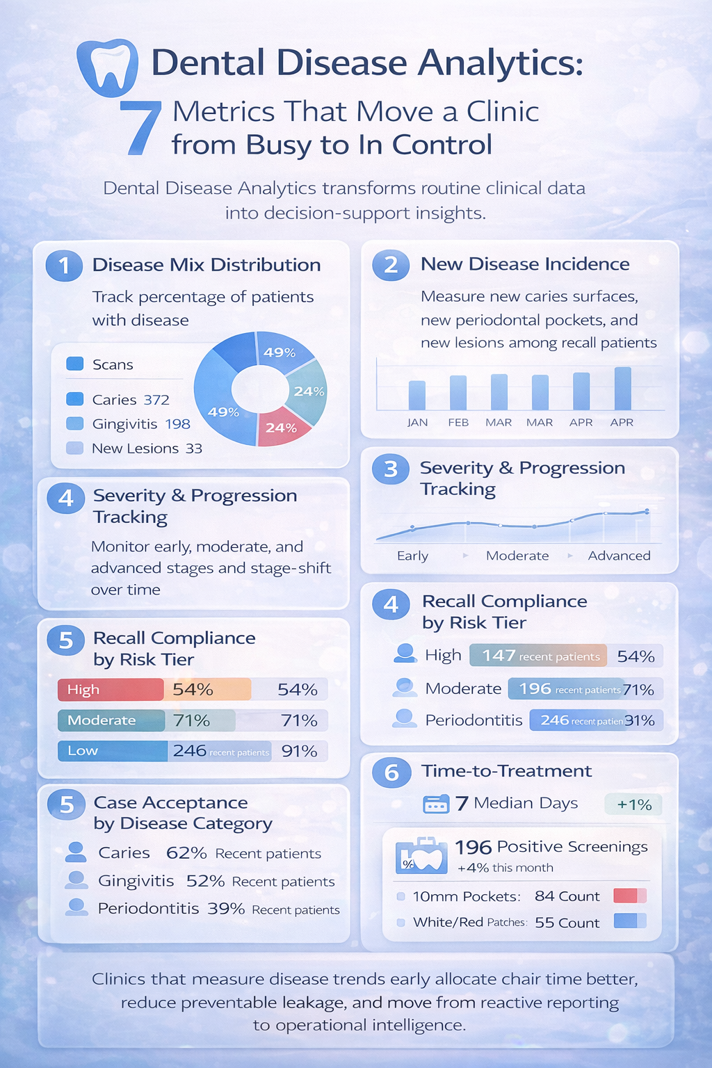 Track disease mix monthly: percentage of patients with caries, periodontal disease, tooth wear, periapical pathology, and suspicious soft tissue findings. Anchor it with consistent definitions (for example, ICD-like mapping or internally standardized categories). The goal is not perfect epidemiology. The goal is repeatable classification.